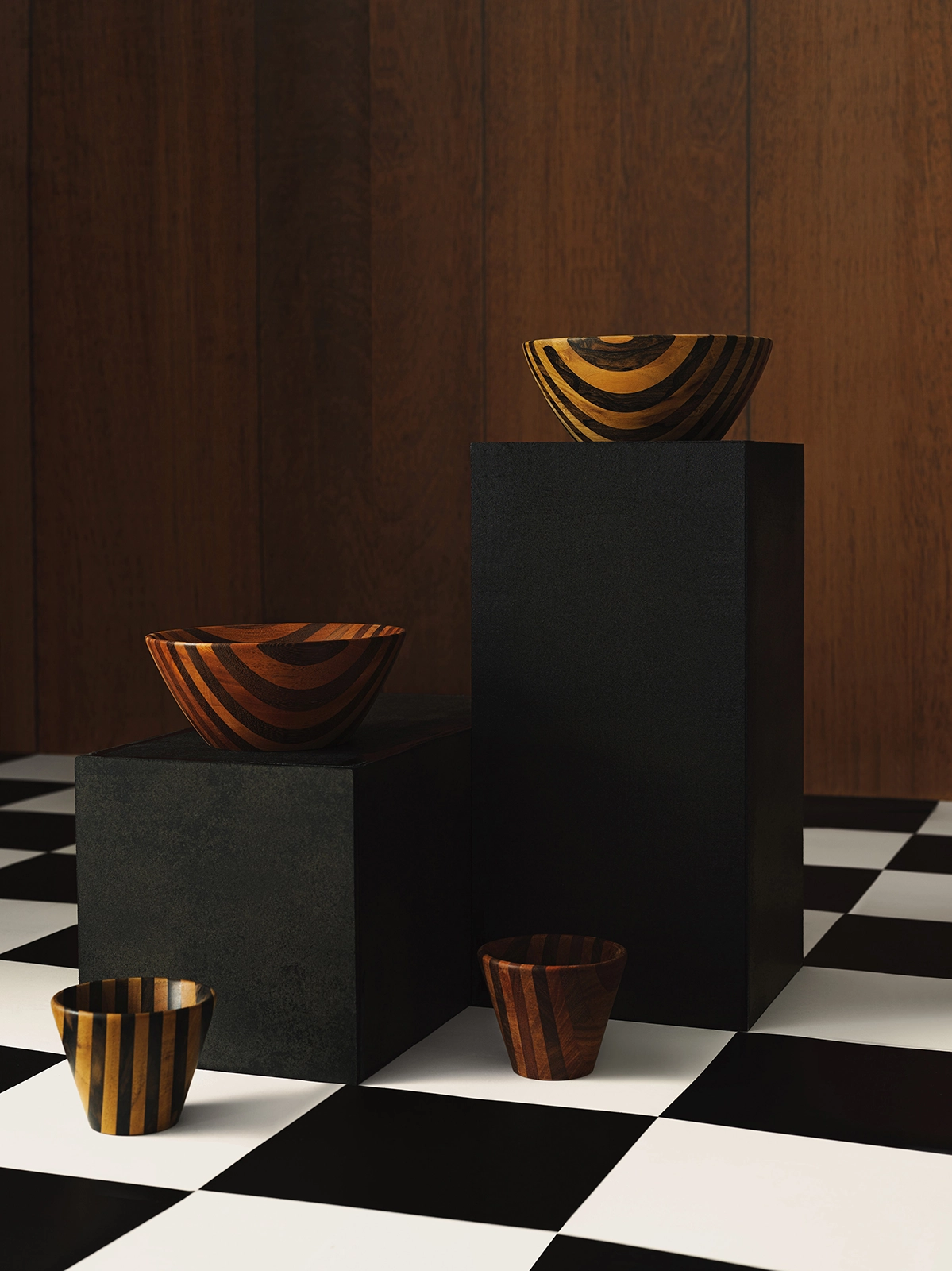 The set was built entirely from scratch, including the checkerboard flooring and custom-printed wood textures, allowing us to create a controlled environment where form, material, and composition could coexist with intention. Styling was approached with restraint, letting the objects speak through balance and proportion rather than excess.